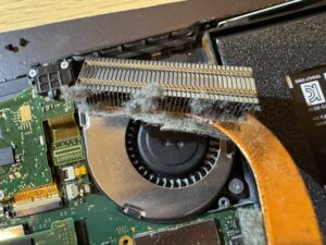 内部の冷却ファン本体+吸気口、排気口にはたくさんのホコリがたまってしまっています。