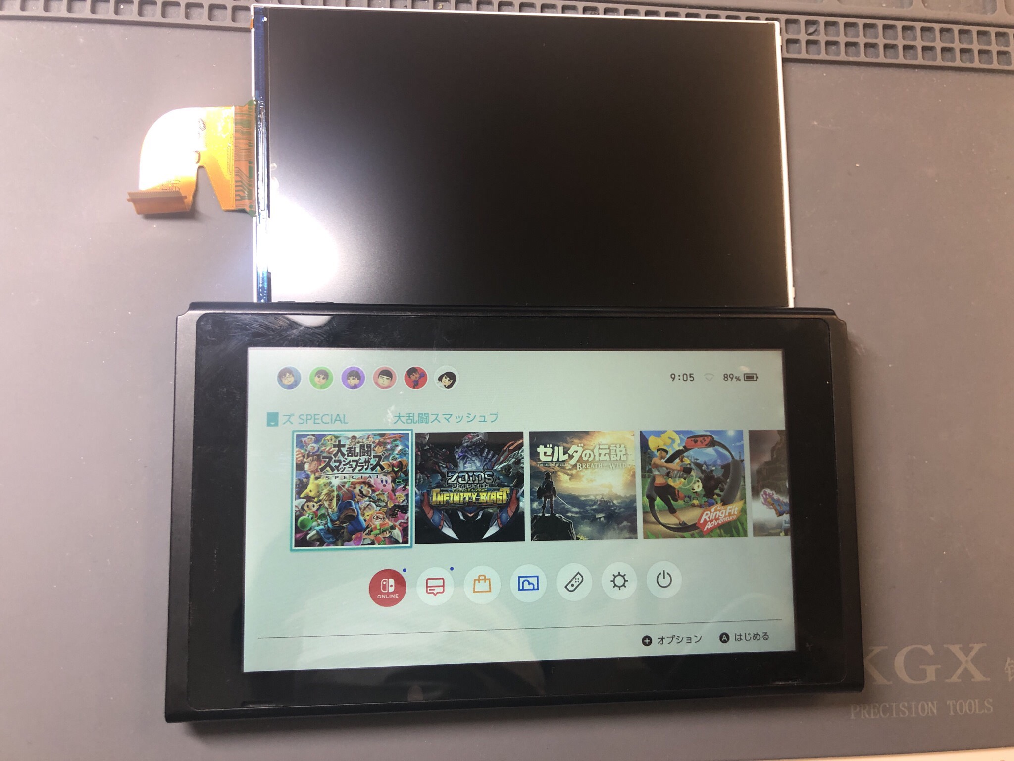 実際お持ち込み頂きご確認すると、画面液晶自体が破損している様で、画面をタップしたり、ジョイコンを押したりすると動いているのが確認。