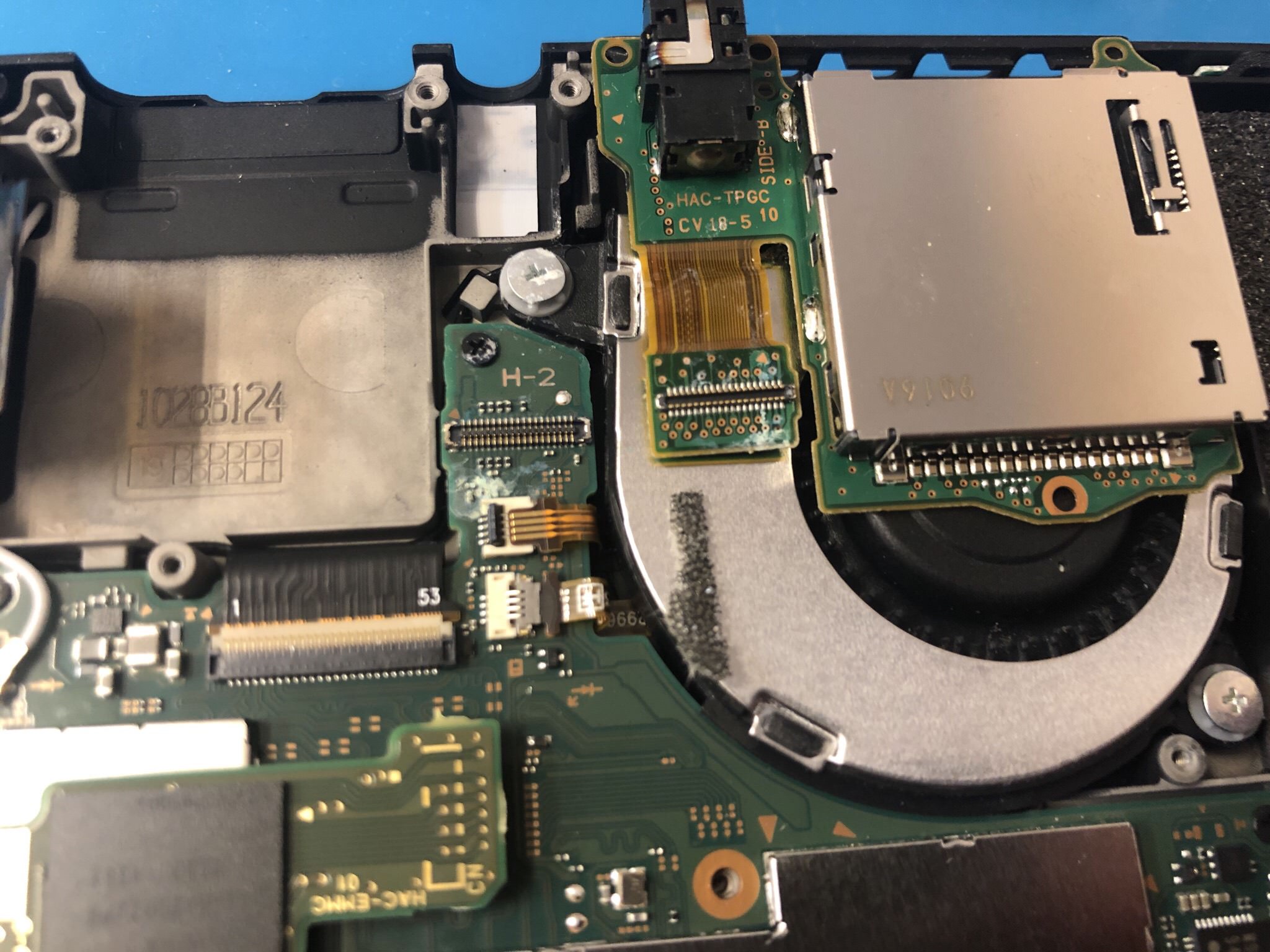 スリープボタンやゲームカードトレーパーツの接続先側まで水没、腐食している状態です。