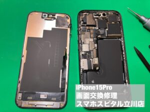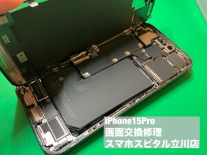 iPhone15Pro ディスプレイ故障によりカラフルな画面が出るだけで正常表示されず…