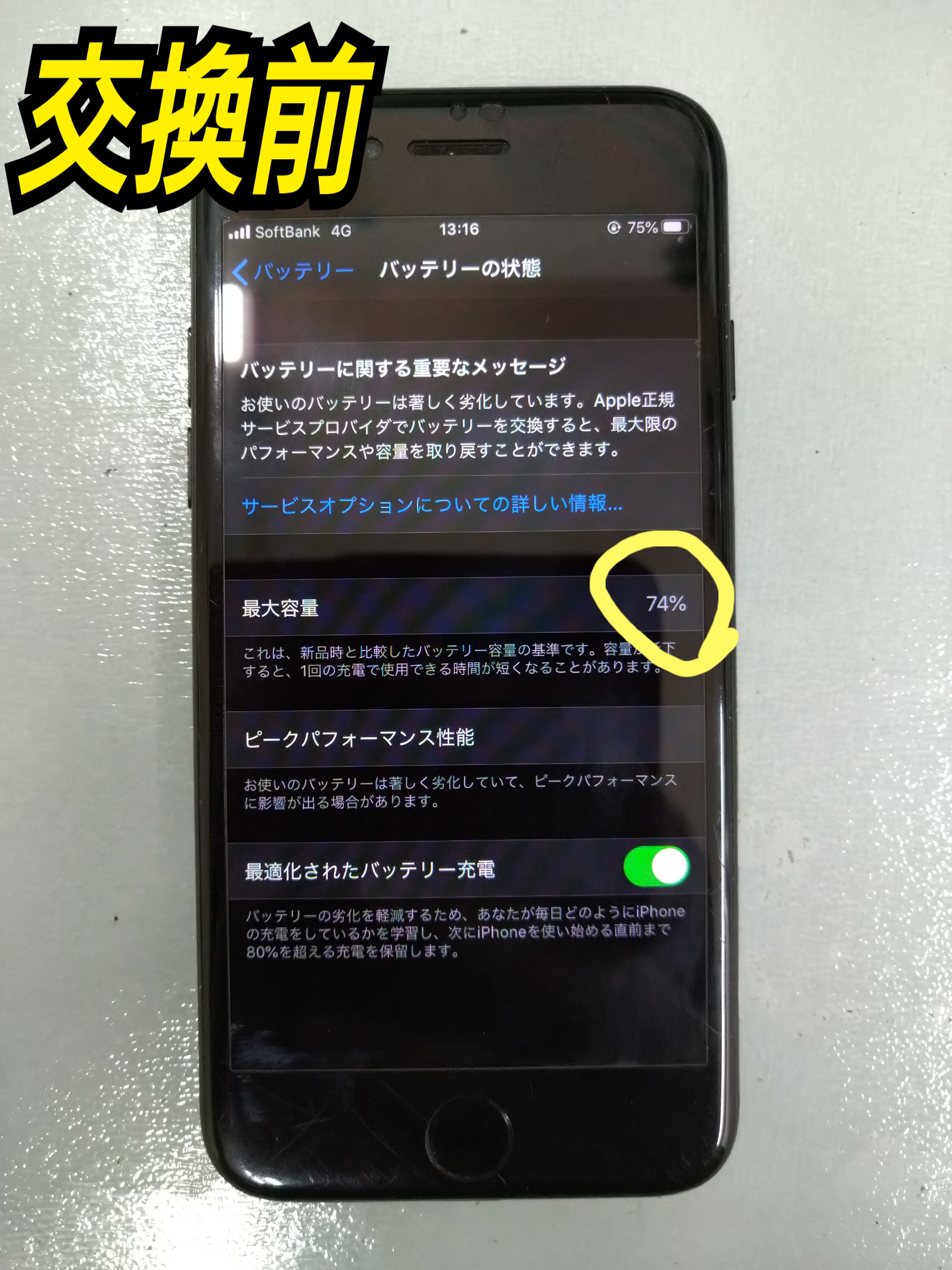 ↑今回修理をさせて頂いたiPhone7。バッテリー交換前は最大容量が74%になっておりました。