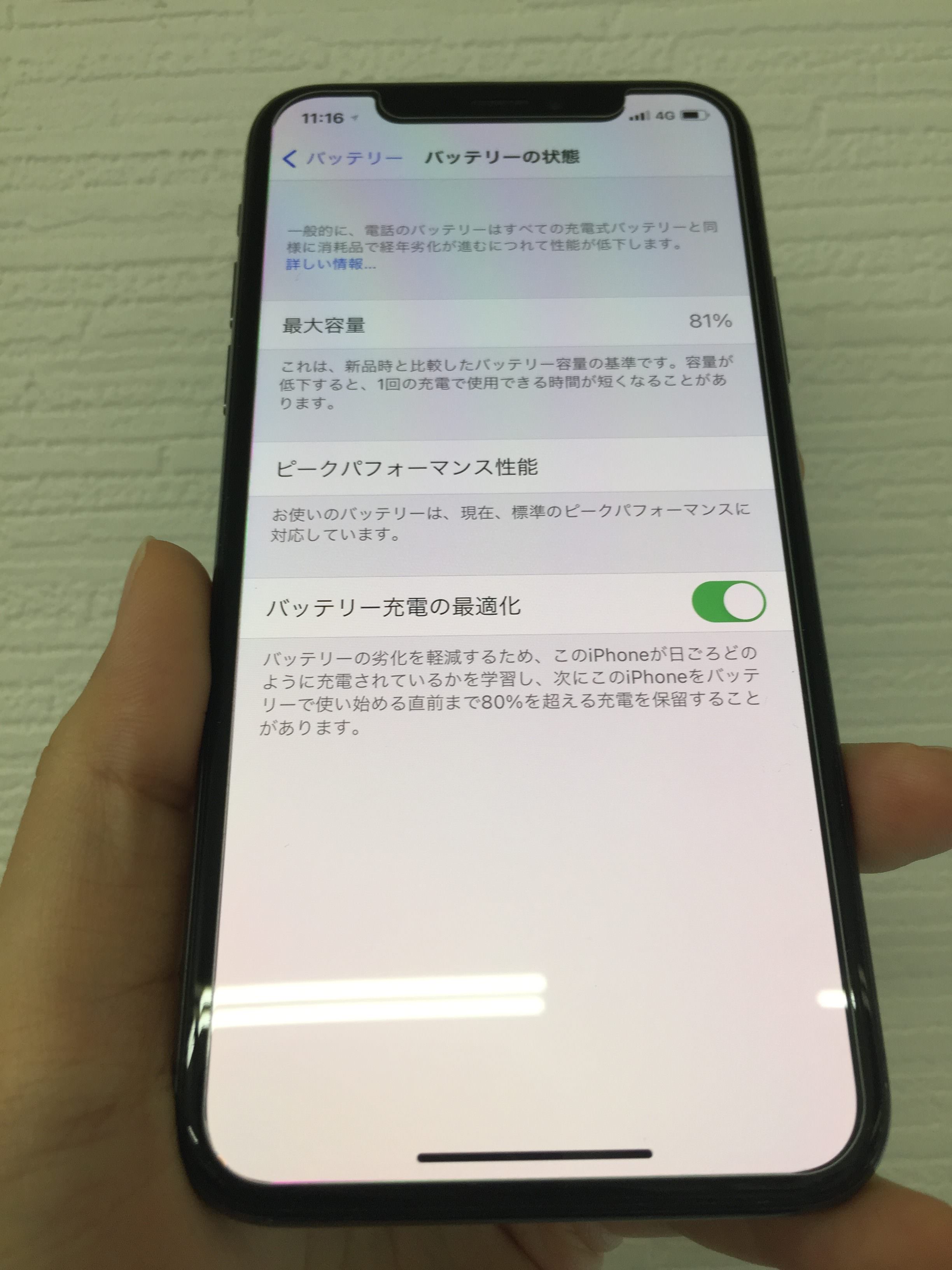 新品の場合は「100%」になっていますが、劣化が進んでくると数字は下がっていき今回のiPhoneXは「81%」になっていました。
