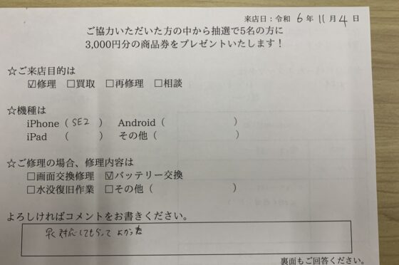お客様の声【iPhoneSE第2世代のバッテリー交換修理】