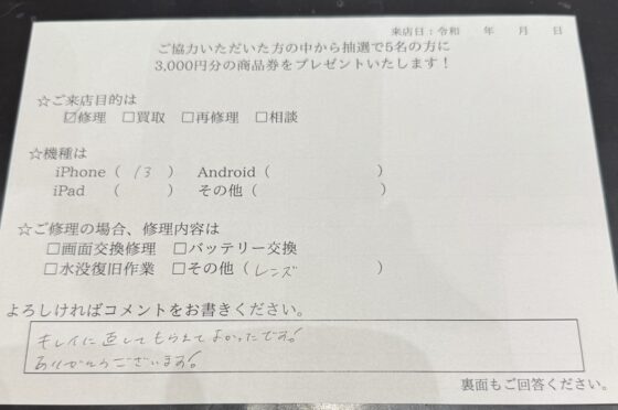 【お客様の声】iPhone13 アウトカメラレンズを交換修理しました!!!