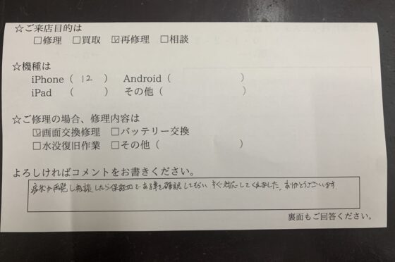 【お客様の声】iPhone12画面交換の再修理
