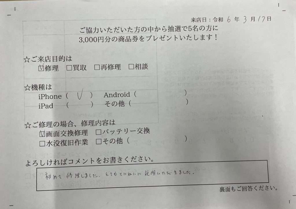 スマホスピタル高槻 iPhone11の画面交換修理でご依頼されたお客様よりお声を頂きました。