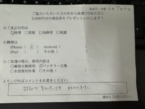 先日、ご来店いただいたiPhone8でばってりー交換をしていただいたお客様から、お客様の声をいただきました。