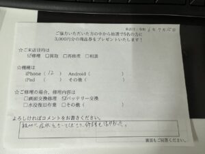 先日、iPhone12のバッテリー交換にご来店下さったお客様から感想を頂きました。