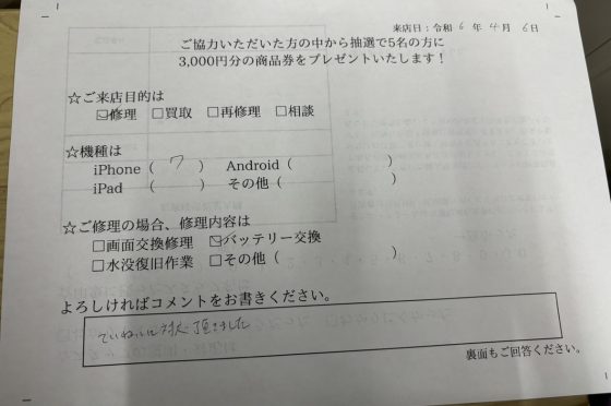 【お客様の声】iPhone 7のバッテリー交換を行ないました。