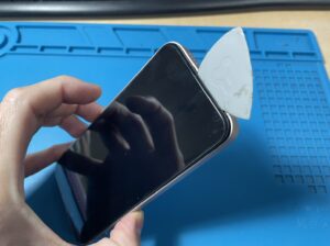 iPhone 13は液晶開けで配線を断線させないように、小さな隙間を作りピックをスライドするように丁寧に開いていきます。