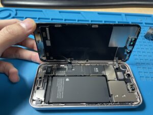 iPhone 13のバッテリーを熱などを用いてゆっくり外していきます。