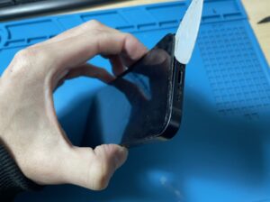 iPhone 12miniは液晶開けで配線を断線させないように、小さな隙間を作りピックをスライドするように丁寧に開いていきます。
