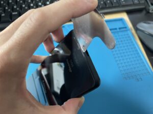 背面を温めて丁寧に開いていきます。電源ボタンとボリュームボタンの配線を切らないように慎重に開いていきます。