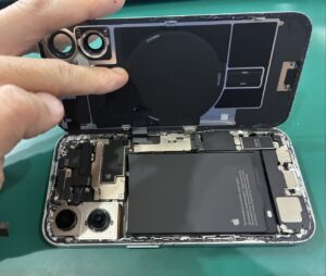 故障しているiPhone 16のバックカメラを取り出して分解はおしまいです。