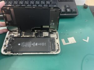 iPhone 11は液晶開けで配線を断線させないように、小さな隙間を作りヘラで粘着を外すように丁寧に開いていきます。横開きにして近接センサーコネクタ、液晶ケーブルコネクタ、バッテリーコネクタにアクセスするためにコネクタカバーを外します。