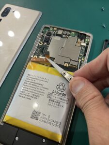シンプルスマホ5のバッテリーはビニールテープを剝がすだけで取り出せる、分解に優しい貼り付けになってます。