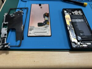 開きかけている画面側をヒートマットで加熱処理し、粘着を緩めつつ解体していきます。