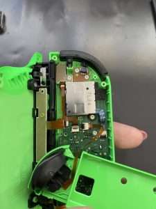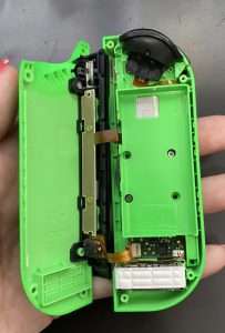右が修理が完了したジョイコン、左に映っているのが取り外したアナログスティックです。