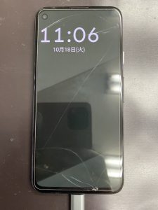 (※ガラスフィルムが割れていますが画面自体は無事です。お客様のご希望により元々割れていたフィルムですが、今回はバッテリー交換のみでフィルムはそのままご返却となります。)