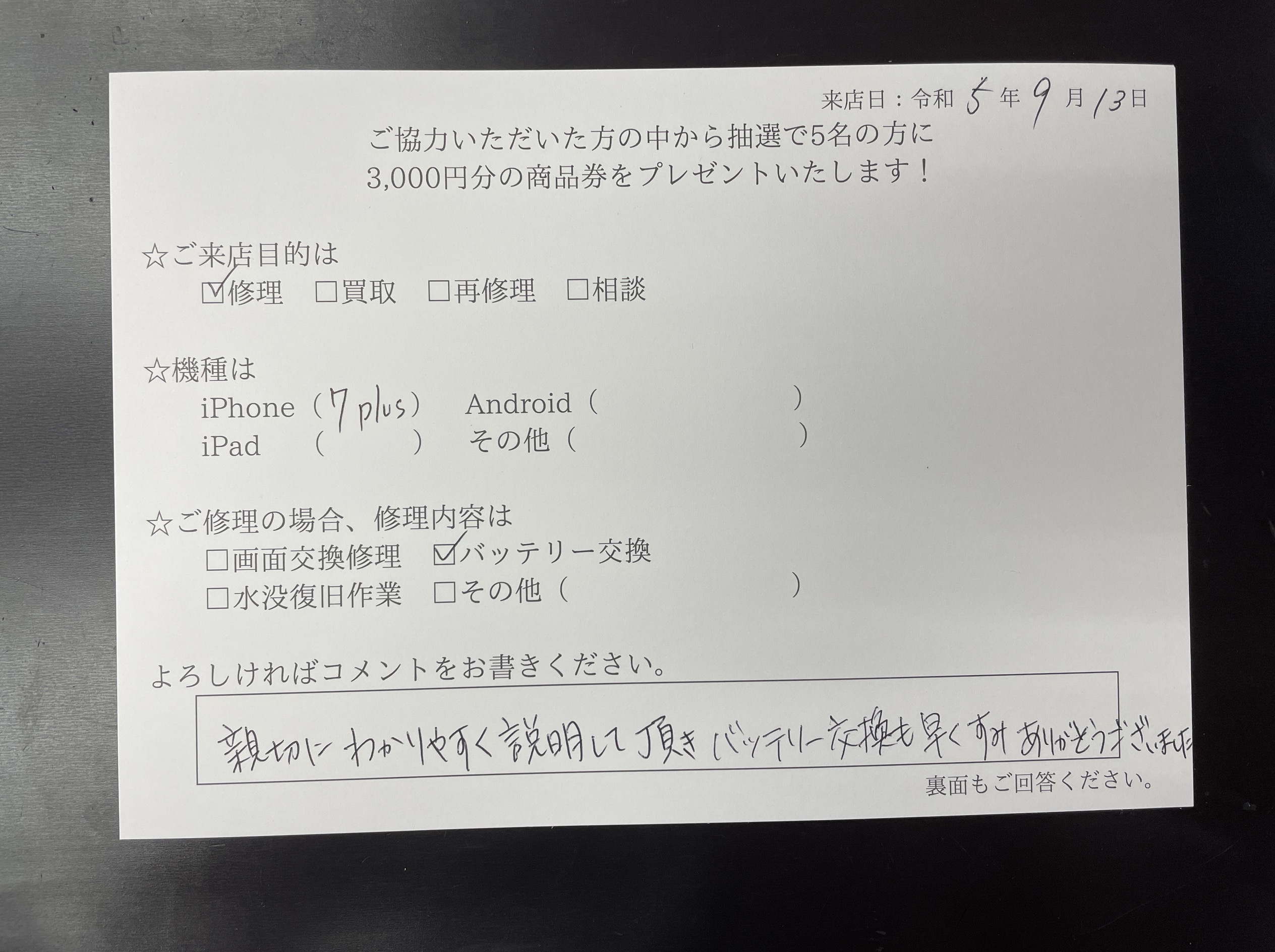 親切に分かりやすく説明して頂きバッテリー交換も早くすみありがとうございました。(本文から抜粋)