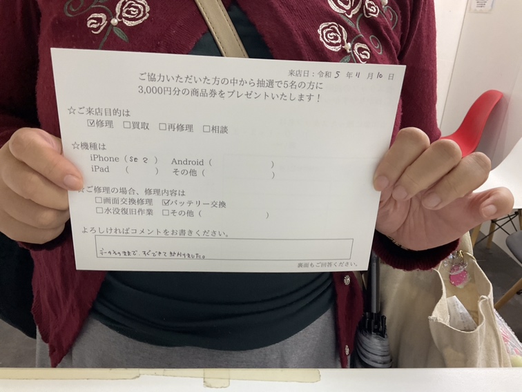 スマホスピタル天王寺ミオ 【お客様の声】iPhone SE2のバッテリー交換修理をさせていただきました!
