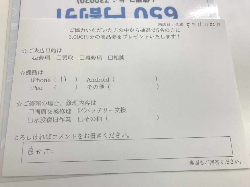 スマホスピタル天王寺ミオ 【お客様の声】iPhone11のバッテリー交換を行いました!