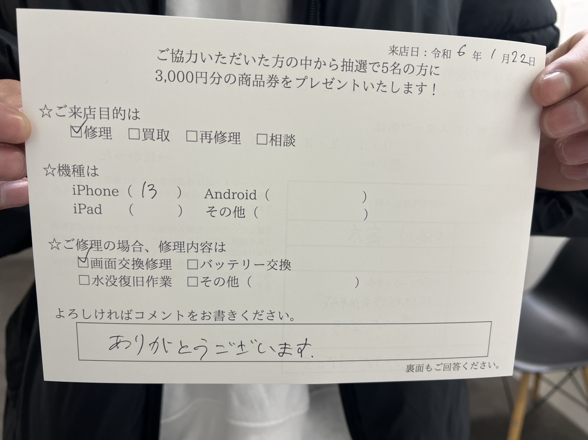 スマホスピタル天王寺ミオ 【お客様の声】iPhone13の画面交換修理をさせていただきました!!