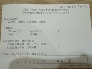 スマホスピタル天王寺ミオ 【お客様の声】iPhone8のバッテリー交換でご来店のお客様!