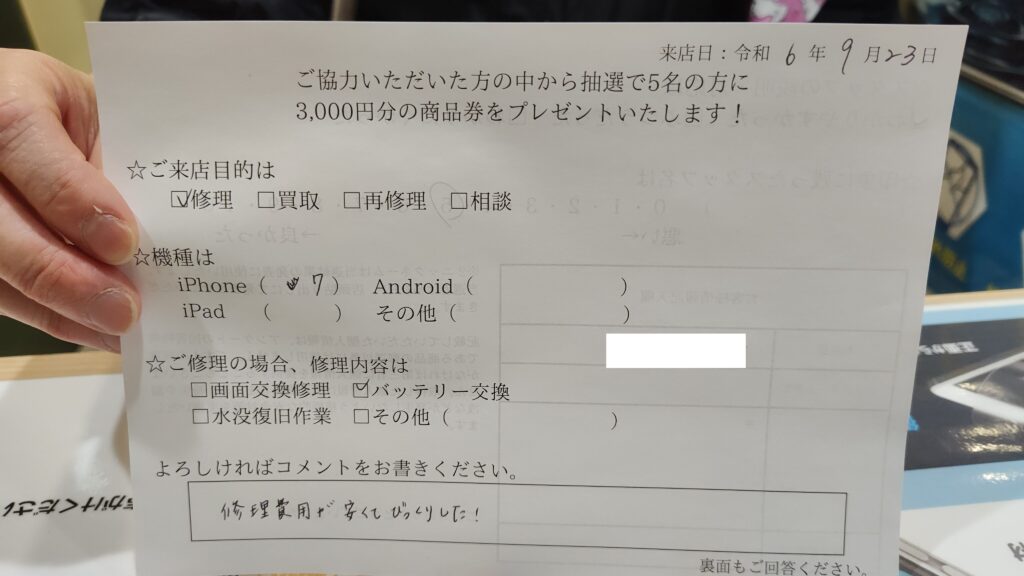 iPhone 7のバッテリーを交換いたしました!