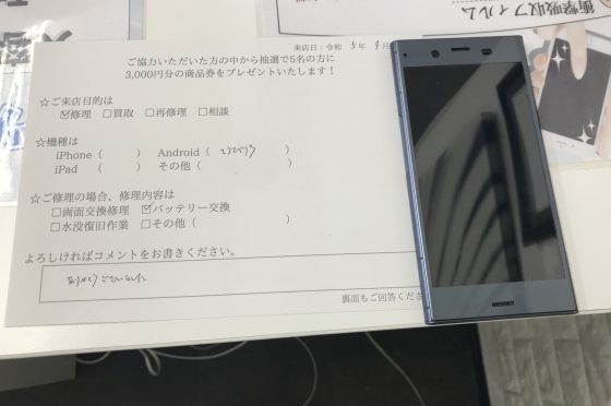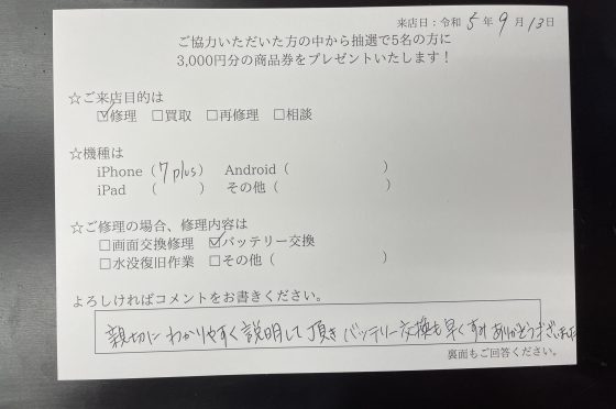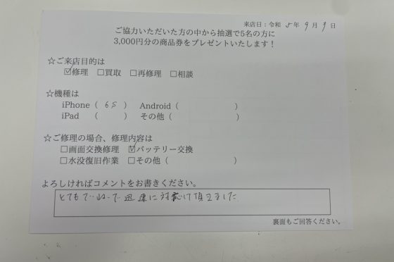(お客様の声)iPhone 6sのバッテリー交換を行いました。