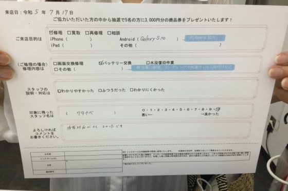 GalaxyS10のバッテリー交換をしていただきました