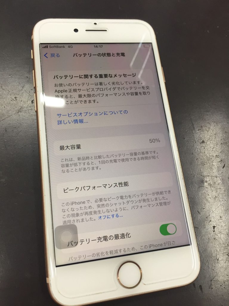 一般的にバッテリー交換の目安は80%前後と言われていますが、今回お預かりした端末のバッテリー最大容量はバッテリー交換目安より30%も低い50%でした。