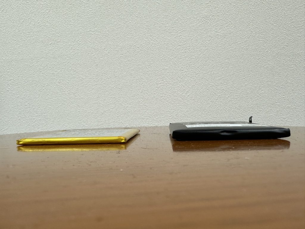 左側が元々のバッテリーの状態(新品)で右側が端末に入っていたバッテリー(膨張した状態)です。