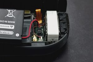 バッテリーが乗っていた内部のフレームを外し手前に返すと基板(緑の部分)が見えます。