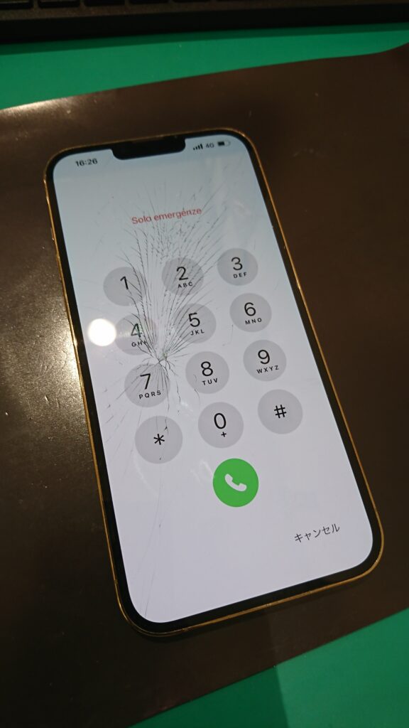 【iPhone13ProMax】ぶつけた衝撃で画面が蜘蛛の巣上に割れてしまった…画面交換で綺麗に出来ますよ!