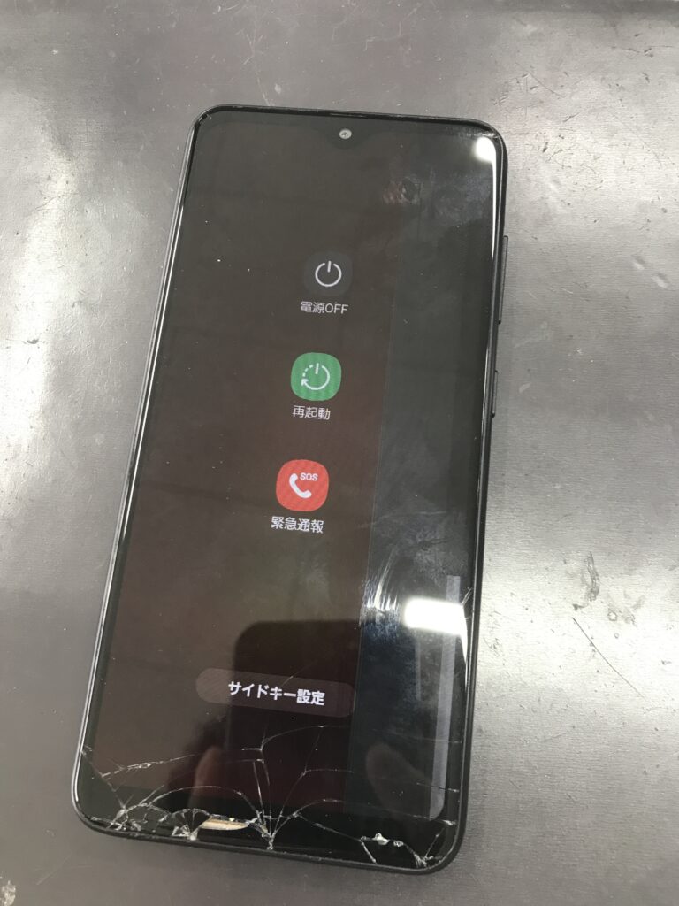 【GalaxyA22】画面が割れてしまい液晶の表示もおかしくなってしまった!データはそのままで修理出来ますよ!