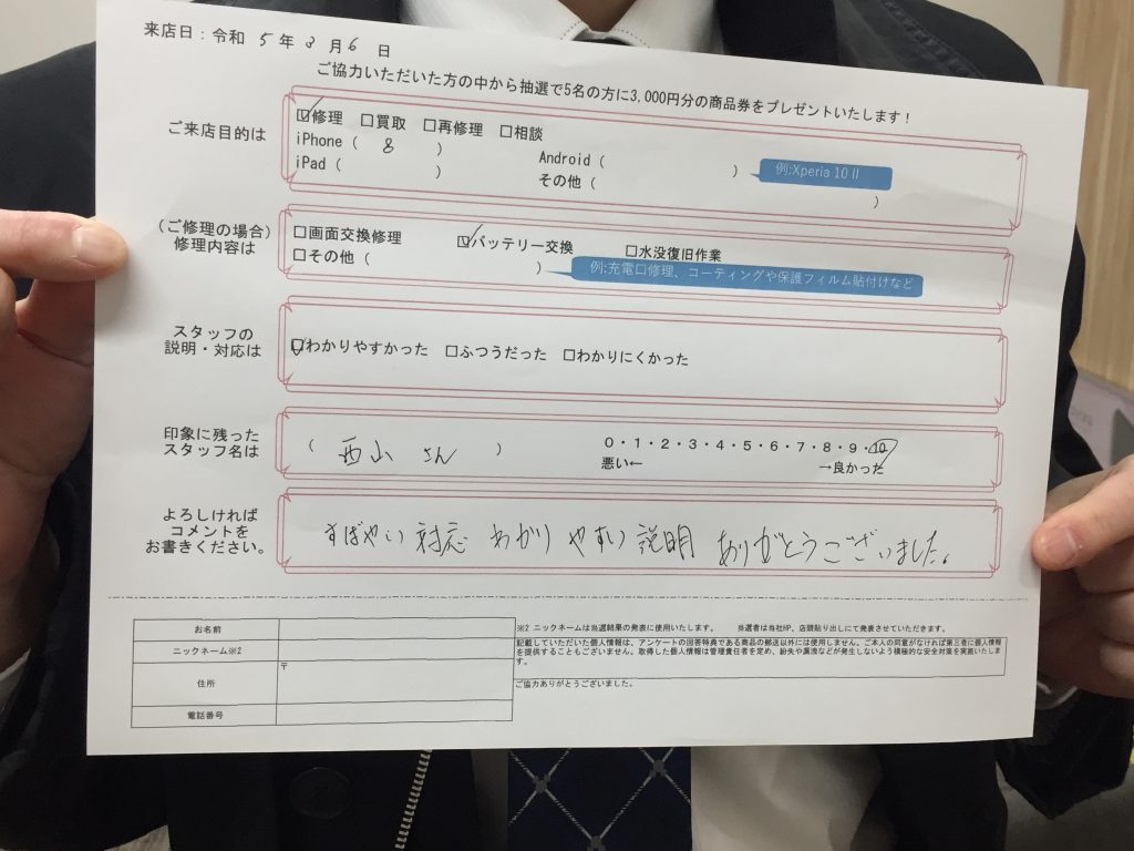 【お客様の声】iPhone8のバッテリー交換させて頂きました!