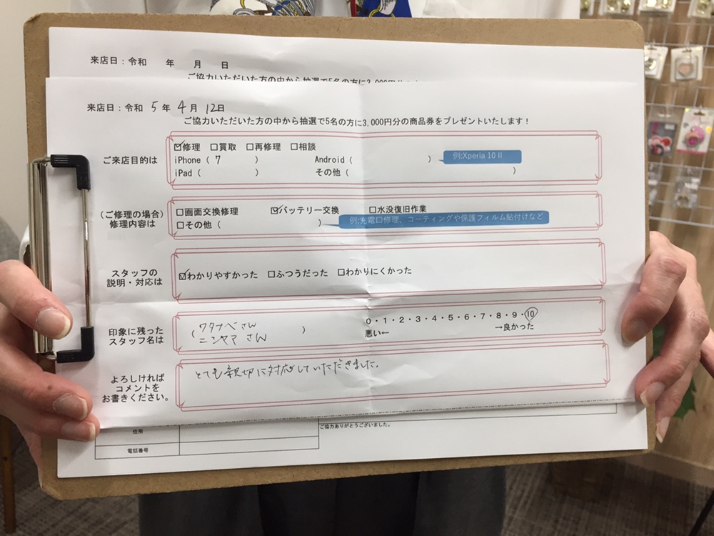 スマホスピタル 大阪梅田 【お客様の声】iPhone7バッテリー交換修理をさせて頂きました。