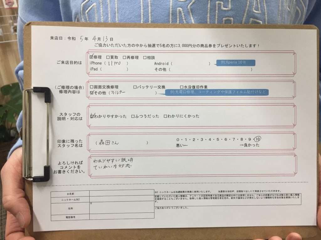 スマホスピタル 大阪梅田 【お客様の声】iPhone11Proガラスフィルム貼り付けさせていただきました!