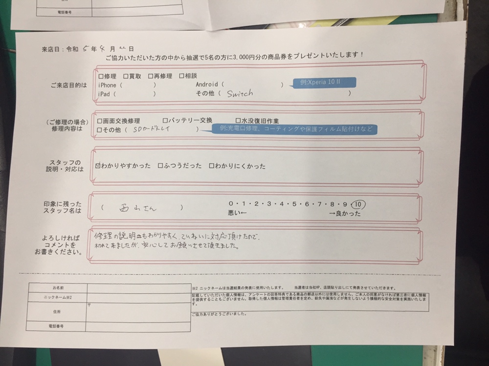 スマホスピタル 大阪梅田 【お客様の声】Nintendo SwitchのSDカードトレイ交換修理をさせて頂きました。
