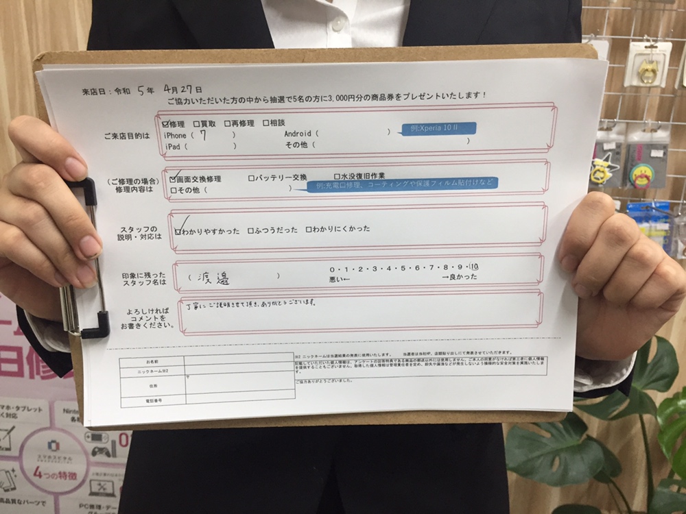スマホスピタル 大阪梅田 【お客様の声】iPhone7画面交換修理をさせて頂きました!