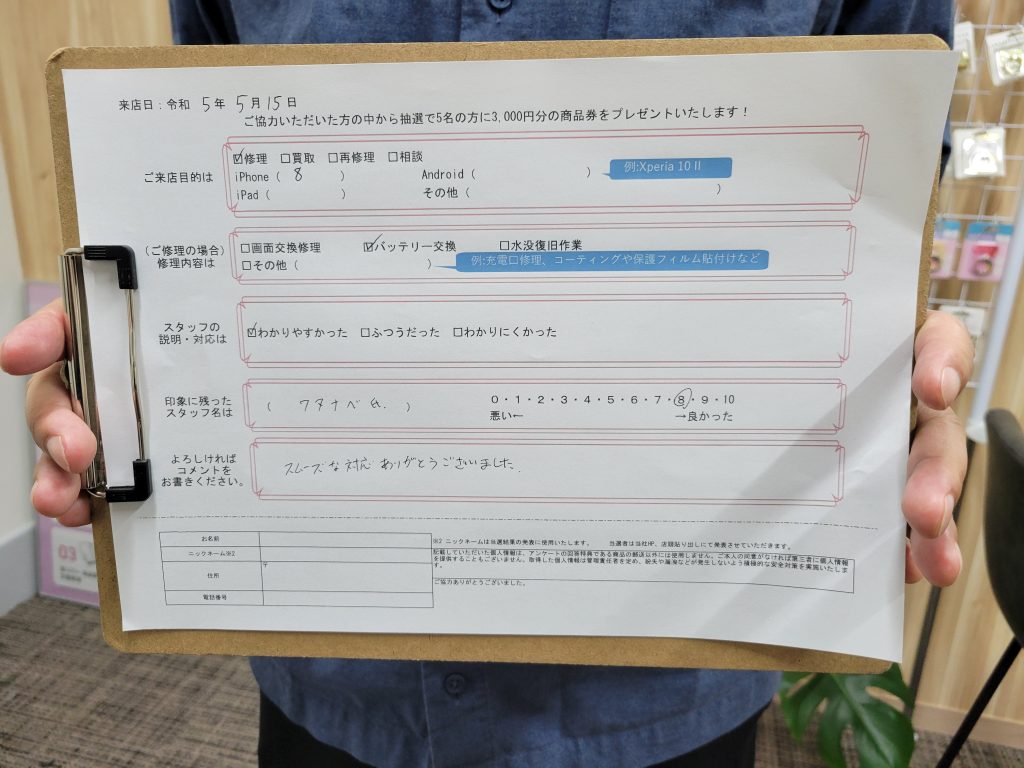 スマホスピタル 大阪梅田 【お客様の声】iPhone8バッテリー交換修理させて頂きました!