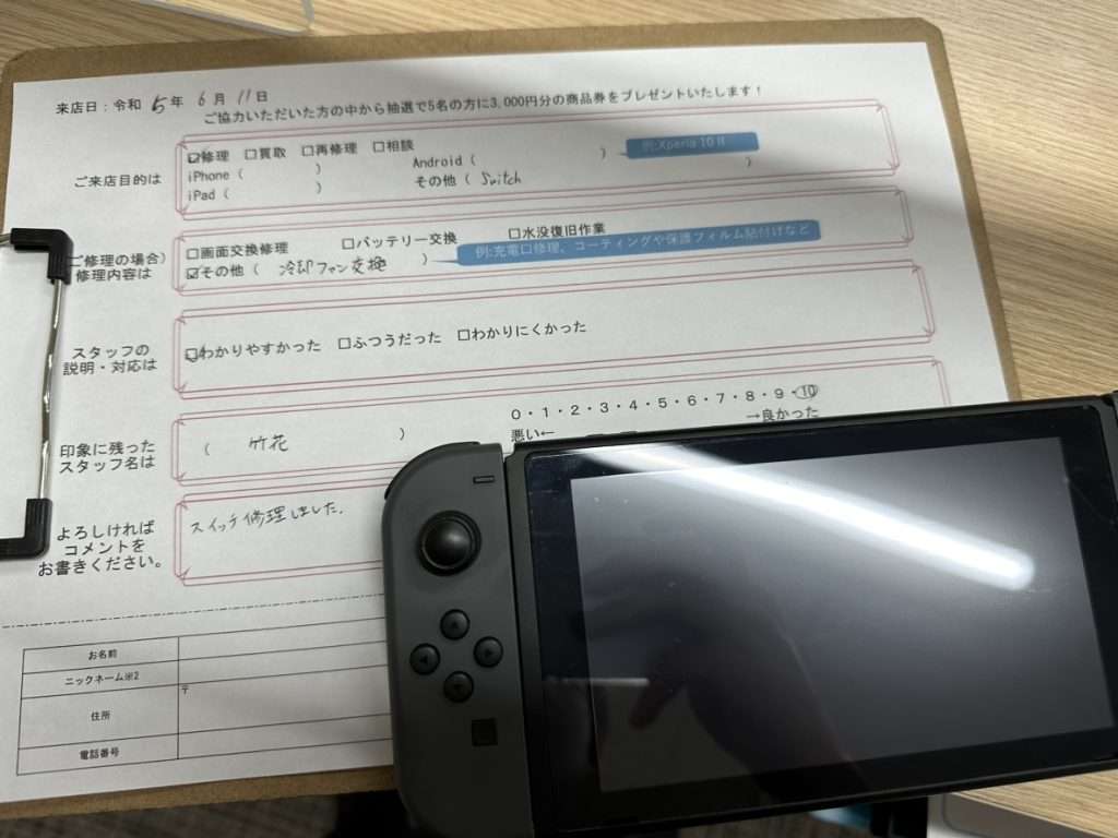 スマホスピタル 大阪梅田 【お客様の声】Switch冷却ファンの交換修理をさせて頂きました。