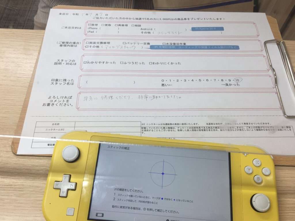 スマホスピタル 大阪梅田 【お客様の声】SwitchLiteアナログスティック交換をさせて頂きました。
