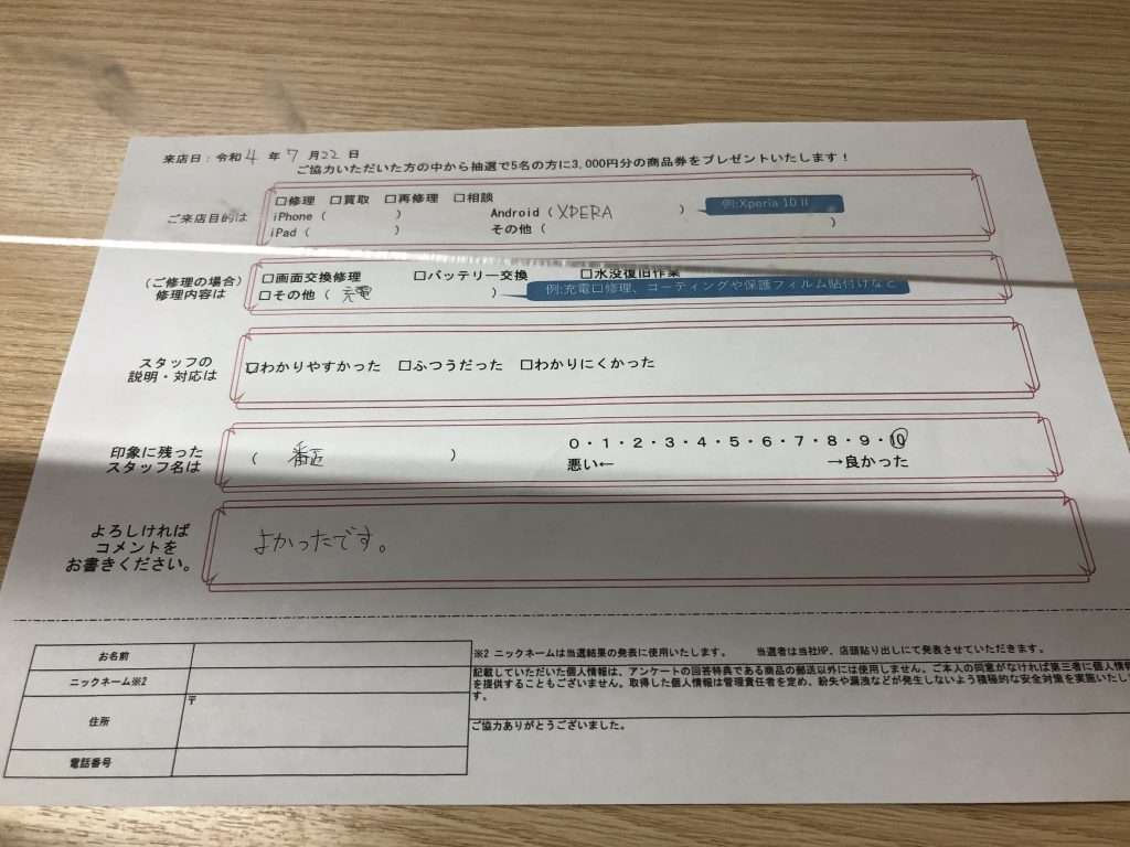 スマホスピタル 大阪梅田 【お客様の声】Xperia充電口メンテナンスさせて頂きました。