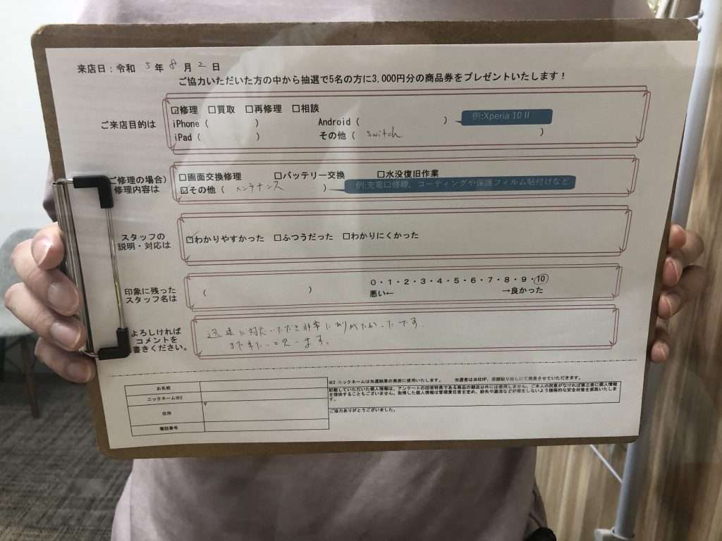 スマホスピタル 大阪梅田 【お客様の声】switchのメンテナンスさせていただきました!