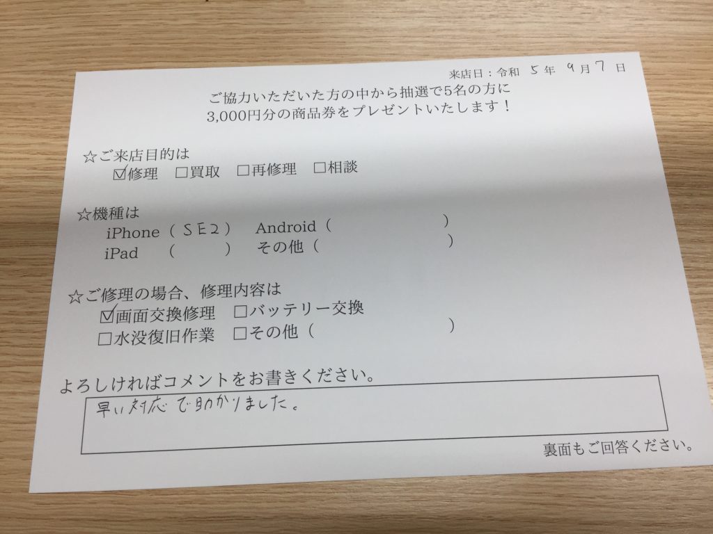 スマホスピタル 大阪梅田 【お客様の声】iPhoneSE2画面交換修理させて頂きました!