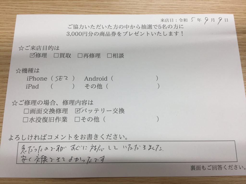 スマホスピタル 大阪梅田 【お客様の声】iPhoneSE2バッテリー交換修理させて頂きました。