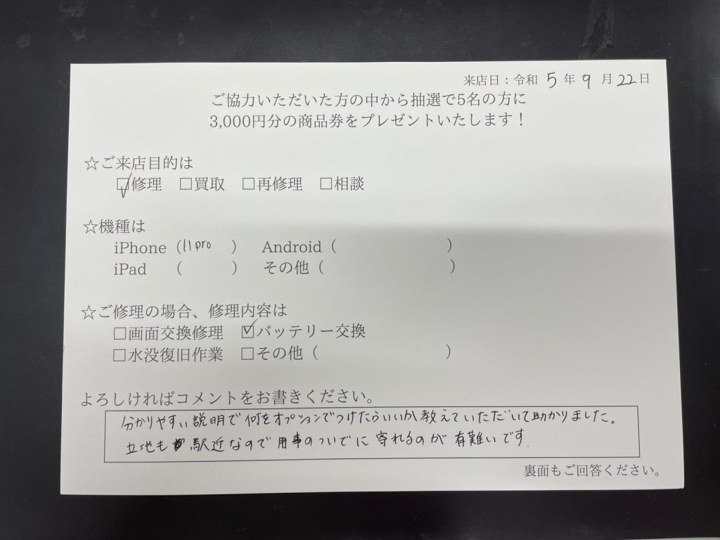 スマホスピタル 大阪梅田 【お客様の声】iPhone11Proバッテリー交換修理させて頂きました!