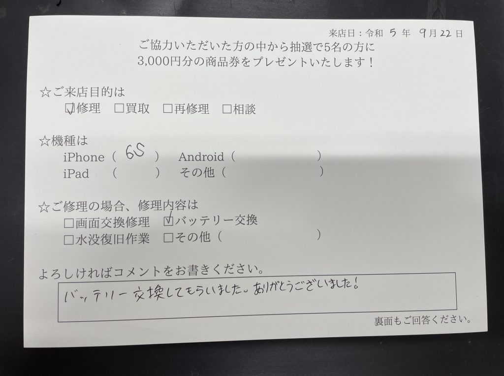 スマホスピタル 大阪梅田 【お客様の声】iPhone6sバッテリー交換修理させて頂きました!